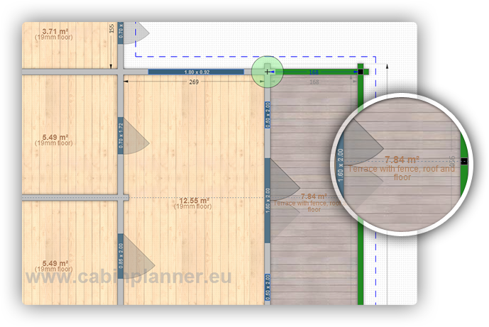 Une fois les murs externes et internes terminés, vous pouvez commencer à dessiner des terrasses. Une terrasse peut être dessinée avec différentes mesures, avec ou sans clôtures. Les terrasses peuvent également être avec une toiture au-dessus ou simplement avec des planches de terrasse. L'entrée aux terrasses peut être réglée selon vos besoins. Cabinplanner® permet également à ses utilisateurs de planifier une mezzanine au-dessus de toute la maison ou de certaines parties de celle-ci.