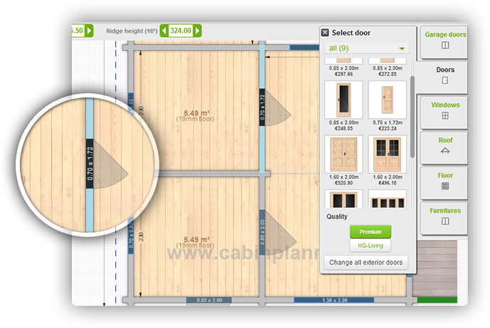 Cliquer sur une porte pour choisir le sens et le côté d'ouverture. Les portes et les fenêtres sont toutes à double vitrage avec du verre de 4 mm + 16 mm + 4 mm. Cabinplanner vous permet également de choisir des différentes qualités de cadres de fenêtres et de portes. Vous pouvez choisir une fenêtre et des portes de type maison d'été basique de haute qualité ou des portes et fenêtres de maison de vie standard européenne.